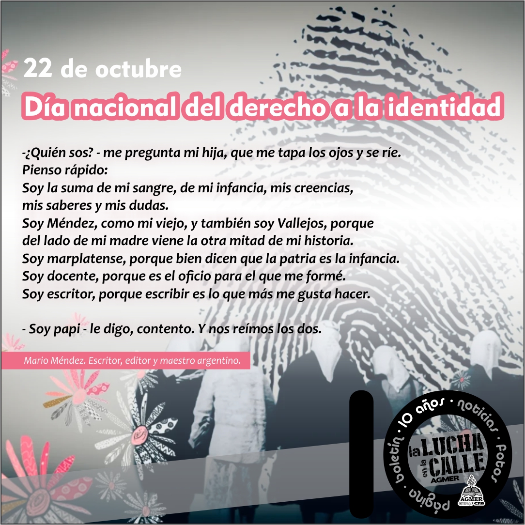 Con la Ley Nº 26.001, el 22 de octubre del 2004, el Congreso de la Nación instituyó el Día Nacional por el Derecho a la Identidad, pues fue en esa fecha, pero del año 1977, en que las Abuelas de Plaza de Mayo comenzaron su incansable búsqueda.