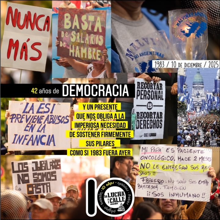 Rememorar un día como hoy es entender que nada de lo que se celebró en las calles aquel 10 de diciembre hace 42 años está garantizado. Cada logro conseguido luego de aquella eterna noche de la dictadura, que tanto nos costó como país, está amenazado y en disputa. El paso del tiempo, que por momentos afianzó el convencimiento por lo que no queríamos NUNCA MÁS, ha ablandado las tensas sogas con las que debemos amarrar cada conquista para defenderlas. Nada está dado porque si, y todo lo que conseguimos, si no tomamos consciencia y lo defendemos, nos lo pueden quitar en cualquier momento. Demasiados intereses hay en ello, y nunca son los que están del lado de las y los trabajadores y el pueblo.